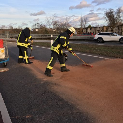 Samstagmittags wurden wir zu einer Ölspur auf der B42 in der Ausfahrt bei Kiedrich alarmiert. Dort sollten mehrer Liter Öl aus einem Fass, auf die Straße gelaufen sein.